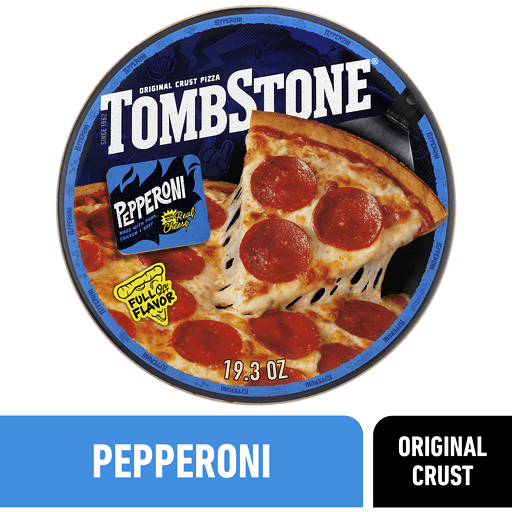 Tombstone Pepperoni Frozen Pizza delivers full on flavor held up by a buttery and crispy crust. This Tombstone pizza comes topped with zesty sauce, real cheese along with two layers of pepperoni on a buttery, crispy crust for a delicious family meal that's sure to satisfy. Tombstone frozen pepperoni pizza is made with 1/4 lb of real cheese. This frozen pepperoni pizza is easy to bake in the oven for a quick anytime meal or easy dinner that delivers full on flavor. Keep Tombstone pizza frozen until ready to oven bake.